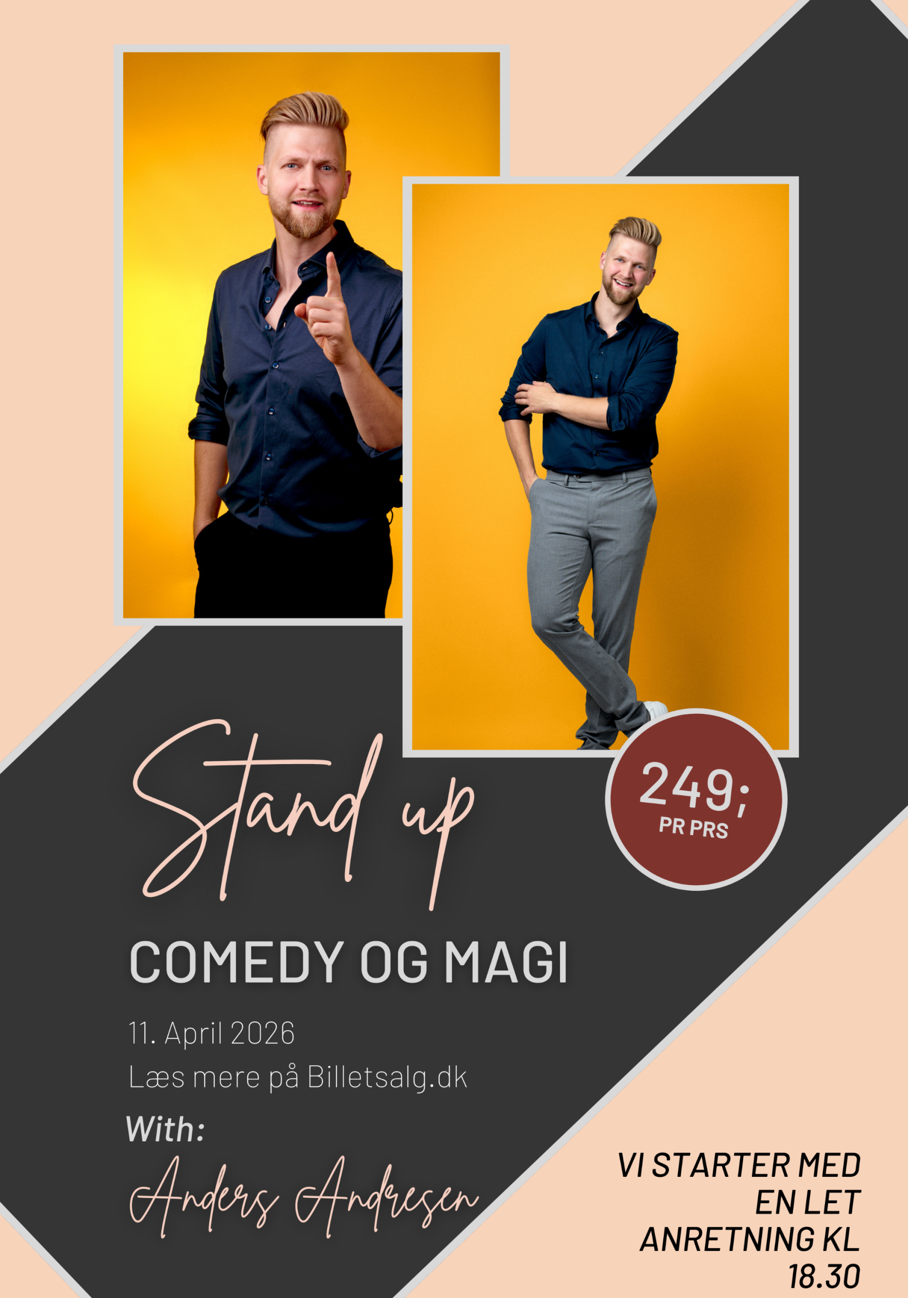 Vi varmer op med let anretning kl. 18.30, så alle kan få noget i ganen inden showet går løs – og dørene åbner allerede ca. kl. 17.30, så kom i god tid, find bord, snup en drink og mærk stemningen bygge sig op.